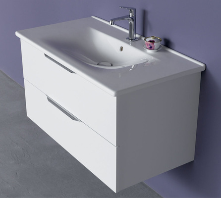 Sanitärkörper: Aufsatzwaschbecken 71 cm, Waschtisch 65, 70, 80, 85, 90, 93, 100, 105, 120 und 123 cm jeweils inkl. Waschtischunterschrank, Doppelwaschtisch 130 und 133 cm jeweils inkl. Waschtischunterschrank, Stand- und Wand-WC-Tiefspüler, Wand- und Standbidet, Keramik schmutzabweisend