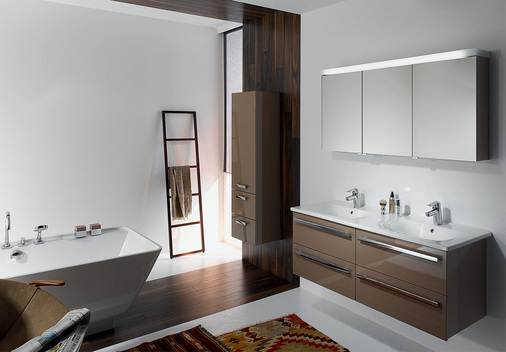 Dazu passt indirektes, blendfreies Licht von oben. Doch auch ohne die optionale LED-Waschtischbeleuchtung bietet die Ausstattung der Spiegelschränke mit zwei bzw. drei beidseitig verspiegelten Türen zahlreiche Annehmlichkeiten: Glaseinlegeböden, Doppelsteckdose, Vergrößerungsspiegel sowie eine Magnetleiste. Außerdem sehen die Sets Kombinationen aus Waschtischen mit Leuchtspiegeln vor. Hochschrank, halbhoher Schrank sowie weitere passende Keramik- und Mineralgusslösungen aus dem Programm von Burgbad runden das Sortiment ab.