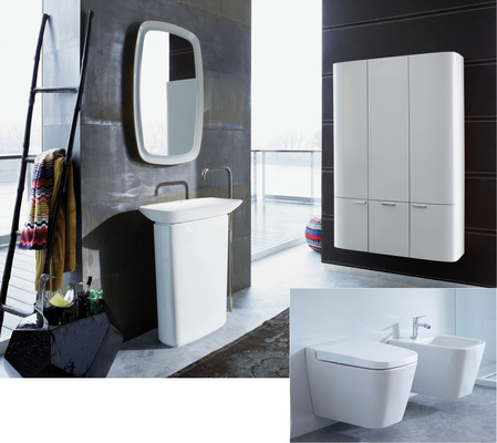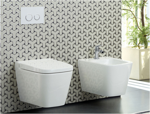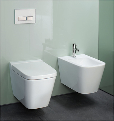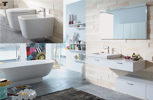 Sanitärkörper: Waschtisch 65, 93, 123 sowie Doppelwaschtisch 133 cm, alle mit Halb- oder Standsäule, Aufsatzwaschtisch 71 cm, Waschtisch mit Konsole oder Unterschrank symmetrisch 132 und 160 cm, Aufsatzwaschtisch mit Konsole oder Unterschrank symmetrisch 160 cm, Waschtisch mit Konsole oder Unterschrank asymmetrisch 126 und 154 cm, Aufsatzwaschtisch mit Konsole oder Unterschrank asymmetrisch 152 cm, Wand-WC Tiefspüler, Stand-WC Tiefspüler, Wandbidet, Standbidet, Keramikteile schmutzabweisend