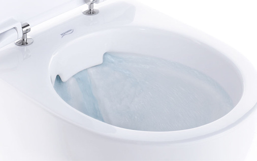 Beim spülrandlosen 4UWand-WC Rimfree steckt der entscheidende Vorteil in der Konstruktion: Die Technologie vermeidet die Bildung von Hohlräumen, in denen Ablagerungen und Schmutznester entstehen können. Ein patentierter Spülverteiler führt das Wasser symmetrisch in das Becken ab und gewährleistet eine einwandfreie Aus- und Flächenspülung.