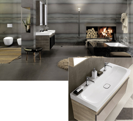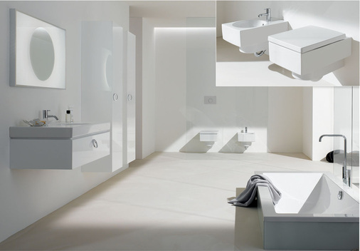 Auch die schlichte Gestaltung des wandhängenden WCs und Bidets harmoniert. Auffällig sind die sanft geschwungene Seitengestaltung und die sich nach unten verjüngende Formgebung. Auch das Möbelprogramm, dessen softe Grundlinie sich sowohl bei den Objekten als auch bei den Griffen wiederfindet, setzt auf Formgebung und Funktionalität. Komplettiert wird die Badserie durch zwei in Form und Funktion abgestimmte Wannen. Das Programm umfasst Waschtische, einen Doppelwaschtisch, Einbauwaschtische, Handwaschbecken, WC und Bidet, Möbelunterschränke, einen Hochschrank, Lichtspiegelelemente sowie die beiden Badewannen.