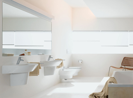 Die WCs und das Bidet orientieren sich an der organisch fließenden Innenkontur der Waschtische und setzen damit einen Spannungspunkt zur strengen Außengeometrie der Becken. Das spülrandlose Wand-WC Rimfree hat durch seine Konstruktion bedingte Vorteile: Die Bildung von Hohlräumen, in denen Ablagerungen und Schmutznester entstehen können, wird vermieden. Ein patentierter Spülverteiler führt das Wasser symmetrisch in das Becken ab und gewährleistet eine einwandfreie Aus- und Flächenspülung.