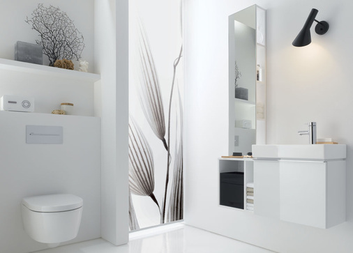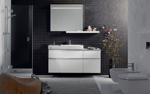 Zusätzlichen Stauraum bieten die Spiegelregale mit reduzierter Ausladung, die über den Seitenelementen oder einzeln installiert werden können. Das Lichtspiegelelement kann sowohl über dem Handwaschbecken als auch versetzt über dem Waschtisch positioniert werden. Komplettiert wird iCon xs durch ein raumökonomisches Tiefspül-WC, dessen Sitz auf Wunsch mit Absenkautomatik lieferbar ist.