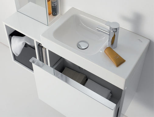 Für die Waschtische und die Handwaschbecken stehen Waschtischunterschränke, Seitenelemente, eine Ablage, ein Regal mit Spiegelfront sowie ein Lichtspiegel zur Auswahl. Die Möbelelemente sind in den Farben Weiß Alpin, Burgund und Platin erhältlich. Das Baukastensystem ermöglicht einen beachtlichen Spielraum bei der An- und Zuordnung der einzelnen Elemente. So erhalten die Waschtischunterschränke ihre logische Ergänzung durch die direkt anschließenden Seitenelemente, die neben einem Fach für Zeitschriften ein separates Fach mit einer schwarzen Plexiglas-Box für benutzte Gästehandtücher aufweisen. Die breiten Waschtischunterschränke sind mit Auszügen ausgestattet.