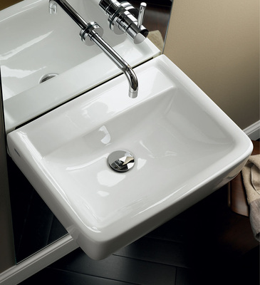 Mit der im rechteckigen Design gestalteten Serie Renova Nr. 1 Plan bietet Keramag auch im design-orientierten und attraktiven Preissegment für den Mietwohnungsbau sowie die öffentlichen und gewerblichen Sanitärbereiche die passenden Produkte. Die eckigen Plan-Waschtische zeichnen sich durch eine strenge Geometrie mit weicher Kummengestaltung und breitem Rand aus. Alle Waschtisch-Modelle können mit Halbsäule und Kerafix-Schnellbefestigung kombiniert werden. Die Waschtische können standardmäßig an der Wand befestigt oder auf einer Platte aufgelegt werden.