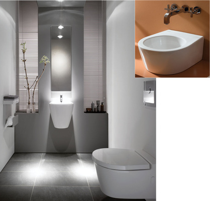 Sanitärkörper: Waschtisch 53 cm mit Ablagefläche rechts oder links, Handwaschbecken 38 cm, Eckhandwaschbecken Schenkellänge 33 cm, Tiefspül-WC kurz 49 cm