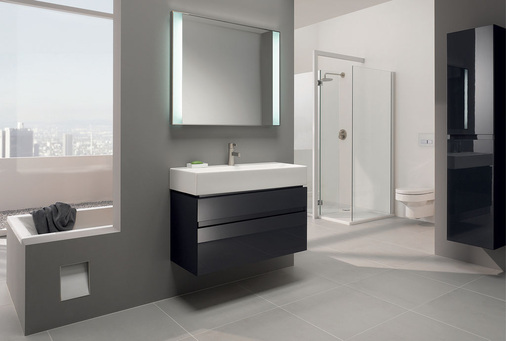Das Programm enthält neben sieben Waschtischvarianten – darunter zwei asymmetrische – ein auch als Rimfree-Ausführung erhältliches Wand-WC, eine bodenstehende Tiefspülkombination sowie ein wandhängendes Bidet. Ein formal angepasstes Möbelprogramm mit Waschtischunterschränken und exklusivem Seitenschrank schafft Stauraum und veredelt die Waschplatzoptik mit lackierten Möbelelementen in Hochglanz Weiß und Quarzgrau sowie durch Lichtspiegel-Elemente.