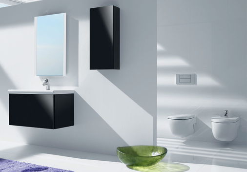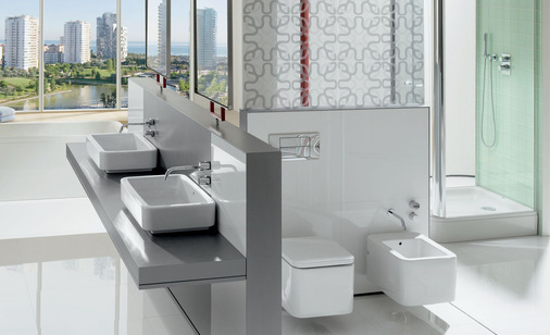 Sanitärkörper: Aufsatzwaschtisch oder wandhängend 75, 65, 55 cm, Halbsäule für Waschtische 75, 65 und 55 cm, Aufsatzwaschtisch sowie wandhängend 65 cm asymmetrisch, Waschtisch-Schale 52 cm, Handwaschbecken unterbaufähig 50 cm ohne Hahnloch, 50 cm mit Hahnloch links oder rechts, 45 cm auf Wunsch mit Handtuchhalter, Wand-WC Tiefspüler (auch als kompakte Version), Stand-WC Tiefspüler für aufgesetzten Spülkasten, Spülkasten, Wand- und Standbidet (auch als kompakte Version), Urinal und neues wasserloses Urinal