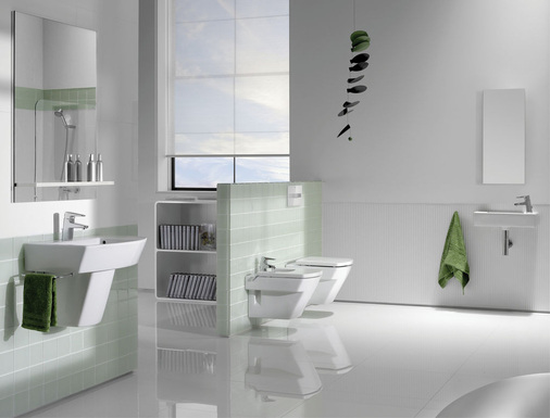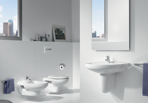 Sanitärkörper: Waschtisch 80, 70 und 60 cm, optional mit Halbsäule oder Standsäule, Waschtisch-Schalen 75, 55 und 45 cm, Stand-WC Tiefspüler für aufgesetzten Spülkasten, Wand-WC, Wand- und Standbidet