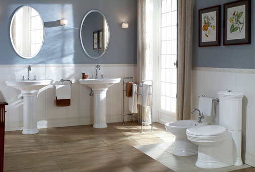Die traditionellen Formen lassen Hommage ausgesprochen prägnant erscheinen und geben ihr eine klassisch stilvolle Anmutung. Die feinen Stufen als typische, dekorative Elemente nehmen der Keramik die Härte und der warme Nussbaumton der Möbel verleiht dem gesamten Bad eine elegante Note. Die aufeinander abgestimmten Sanitärelemente und das passende Möbelprogramm wirken komfortabel, luxuriös und zugleich behaglich, harmonisch sowie dekorativ.