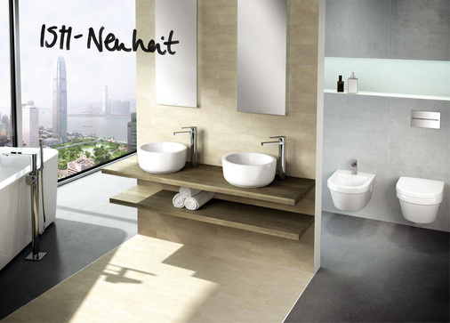 Sanitärkörper: Insgesamt neun verschiedene Waschtische in verschiedenen Formen als Unterbau-, Halbeinbau- und Aufsatzvariante, Aufsatzwaschtisch rund 400 mm, oval und eckig je 600 x 400 mm, Halbeinbauwaschtisch rund 420 mm, oval und eckig je 620 x 420 mm, Unterbauwaschtisch rund 330 mm, oval und eckig je 530 x 330 mm, drei wandhängende WCs (eckiges WC, Architectura Design, Architectura DirectFlush), zwei Back-to-wall WC-Kombinationen 12 inch, zwei Urinale