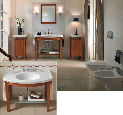 Auch das zu Century passende Möbelprogramm ist ganz in der klassischen Formensprache gehalten. Zur Auswahl stehen ein Unterschrank für den großen Waschtisch – auf Wunsch mit verchromtem Handtuchhalter – und ein Seitenschrank, der mit einer Keramik-Abdeckplatte geliefert werden kann. Wandschrank, Regal und Spiegel vervollständigen das Programm. Die Möbel sind aus Buche Echtholzfurnier, Kirschbaum gebeizt.