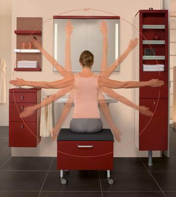 Die Multifunktionalität und Variabilität vieler Elemente erhöht den Nutzungskomfort: Das WC-Möbel mit Haltegriff und integriertem Rollenhalter erleichtert das Aufstehen. Der Seitenschrank am Waschplatz bietet variablen Stauraum. Der Hochschrank mit Ganzkörperspiegel ist durch einen Drehmechanismus gekennzeichnet, sodass seine einzelnen Fächer und Schubladen leicht zu erreichen sind. Der fahrbare Trolley ist so konzipiert, dass die Badbenutzerin oder der Badbenutzer ihn auch als Sitzbank verwenden kann, da sie/er viele Tätigkeiten bequemer im Sitzen ausführt, wie etwa Rasieren oder Schminken. Von der Position des beweglichen Trolleys aus liegt alles wie in einem Cockpit im Greif- und Streckbereich des Sitzenden, vor allem die Fächer, Ablagen und Schubladen des drehbaren Hochschranks. Die Abmessungen der Produkte sind so angelegt, dass sie einen optimalen Bewegungsradius bieten.