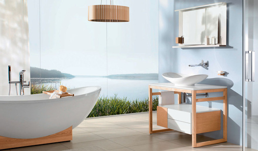 Blickfang der Kollektion ist auch die großzügige Badewanne. Freistehend ruht sie auf einem Holzpodest und wird zum Mittelpunkt des Bades. Alternativ kann sie auch mit Möbelmodul ausgestattet werden; als Einbaulösung ist sie whirlpoolgeeignet.