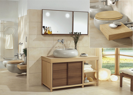 Das WC mit unsichtbarer Befestigung benötigt lediglich 4,5 l Wasser. Die Sitzabdeckung in Kastanienfurnier sorgt für einen natürlichen Look. Für den Nature-Seat kombiniert Villeroy & Boch Echtholzkomponenten mit Duroplast. Auch die Komfortfunktionen Quick Release und Soft Closing kommen zum Einsatz. Der Waschtischunterbau hat einen integrierten Handtuchhalter, die Konsolenschublade ein herausnehmbares Tablett. Eine LED-Beleuchtung gibt es am Spiegel und unter dem Waschtischmöbel. Ein Spiegel mit Metallelementen ermöglicht die individuelle Anordnung von magnetischen Accessoires wie Kleenex-Box oder Wattepadständer. Die austauschbaren Möbelfronten sind neben Kastanie auch in den Farben Sand, Aqua und Grey erhältlich.