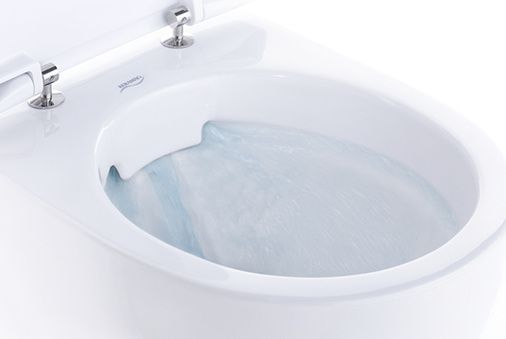 Beim spülrandlosen 4U-Wand-WC Rimfree steckt der Vorteil in der Konstruktion: Die Technologie vermeidet die Bildung von Hohlräumen, in denen Ablagerungen und Schmutznester entstehen können. Ein Spülverteiler führt das Wasser symmetrisch in das Becken ab und soll eine einwandfreie Aus- und Flächenspülung gewährleisten.