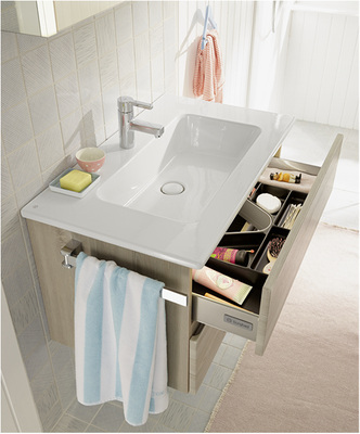 Die vertikalen Leuchten der Spiegelschränke in LED-Technik können in der Lichttemperatur geregelt werden. Der Waschtischunterschrankauszug und der Koffertürenschrank sind optional mit LED-Beleuchtung erhältlich. Zum Sortiment gehört auch der Kosmetikschrank mit nach oben zu öffnender Klappe und integriertem Vergrößerungsspiegel.