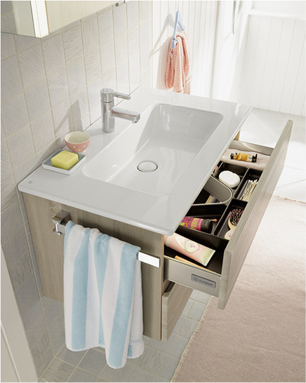 Zentrales Gestaltungselement ist das Rechteck, das übergangslos in eine gerundete, präzise Kumme überführt wird. Neben den Waschtischen mit schmutzabweisender Oberfläche in drei Breiten, ist der speziell für Kleinbäder neu konzipierte Keramikwaschtisch mit einer reduzierten Ausladung von 410 mm erhältlich.
