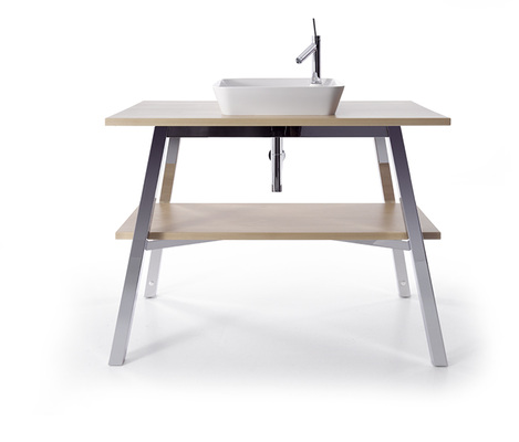 Badmöbel: Waschtischunterbauten mit Chromgestell stehend in 112 x 57 cm, jeweils mit einer Konsolenplatte und einer Ablage unten oder Konsolenplatte mit einem Möbelteil mit Türen und Regalelementen