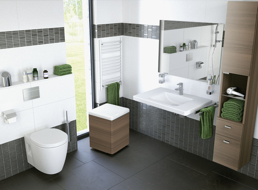 Ein spülrandloses barrierefreies 70-cm-WC sorgt für ein rollstuhlgerechtes Bad, das außerdem ein Plus an Hygiene bietet. Elegante unterfahrbare Waschtische mit umlaufender Griffmulde ergänzen das Connect-Freedom-Sortiment und tragen ebenfalls zu Komfort und Barrierefreiheit bei. Connect Freedom ist nicht nur funktional konzipiert, sondern bietet auch eine ansprechenden Formensprache und verleiht dem Bad einen Wohlfühlcharakter, der generationenübergreifend auch Menschen ohne Handicap anspricht.