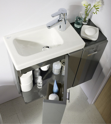 Intelligente Lösungen für Kleinstbäder sind beispielsweise die kompakten Einheiten aus kleinem Waschbecken und dazu passenden Waschtisch-Unterschränken mit cleverem Innenleben und praktischen Aufbewahrungslösungen. Auch die Unterschränke für Handwaschbecken mit innovativer, L-förmiger Tür benötigen weniger Platz beim Öffnen und bieten zusätzlichen Stauraum durch einen herausnehmbaren Behälter.