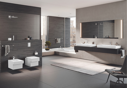 Die eckig geformte Cube Keramik verwandelt private Bäder ebenso wie moderne Hotelbäder in echte Designobjekte. Die Waschtische, WCs und Bidets wurden von dem vielfach ausgezeichneten Grohe-Design-Team passend zu den geometrischen Armaturenlinien Eurocube, Lineare, Allure und Allure Brilliant entworfen. Mit Cube Keramik lässt sich so ein klares Stil-Statement setzen. Die hochwertigen WCs verfügen neben der randlosen Spültechnologie standardmäßig über die innovative PureGuard-Hygieneoberfläche, die aus einer antibakteriellen Glasur sowie aus einer reinigungsfreundlichen Oberflächenbeschichtung besteht.