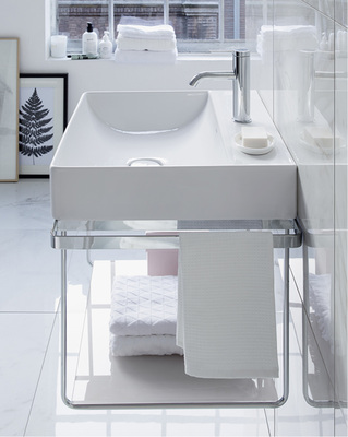 Zum besonderen Hingucker im Bad werden die Becken in Kombination mit dem neuen Möbelaccessoire. Dieser flexible Unterbau ist höhenverstellbar und in Silber (Chrom) oder Schwarz matt erhältlich. Ein Glaseinleger im Möbelaccessoire, der in sechs verschiedenen Farben angeboten wird, bringt individuelle Farbtupfer ins Bad und ist mit allen Möbelprogrammen von Duravit kombinierbar.