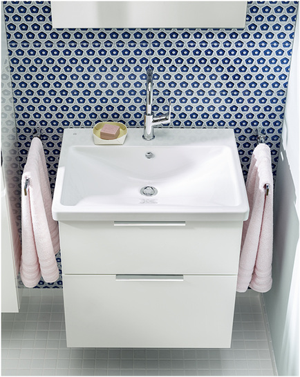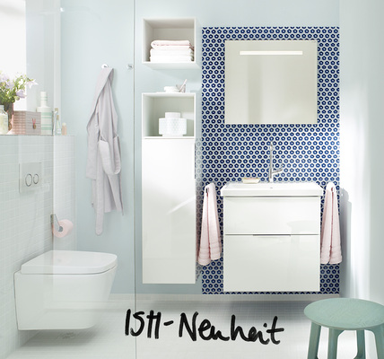 Eqio macht es möglich, in einem Bad von nur 4 m 2 mit WC und Dusche bzw. Badewanne, einen großen Waschplatz mit Spiegelschrank und ausreichend Stauraum für die Familie zu schaffen. Das Programm kann sich dem gegebenen Raumangebot anpassen und wächst mit den Bedürfnissen.