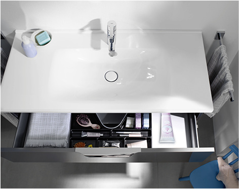 Funktionalität und Qualität sind auch bei Einsteigerprogrammen ein Muss, ebenso das Überdauern kurzlebiger Trends. Diese Ansprüche meistert die burgbad-Serie Essento mit einem textilen Bezug: So wirken die Keramik-Waschbecken, nicht nichtzuletzt auch aufgrund ihrer aufdas technisch notwendige Minimumreduzierten Materialstärke,wie ein weiches Tuch. Es formtsich zu großzügigen Mulden sowie komfortablen Ablageflächen und spricht geradezu eine Einladungaus, mit schnörkellosen,geradlinigen Schränken kombiniert zu werden. Deren moderne horizontaleAufteilung wird durch chromfarbene Griffleisten unterstrichen.Optional ermöglichen die überstehendenFronten aber auch einengrifflosen Auftritt. Eine weitere Alternative sind Stangengriffe. Alle Waschtischunterschränke sind hochwertig mit Auszügenausgestattet. Hochschränke und halbhohe Varianten zeichnensich durch eine geschickte Aufteilung in Türen, Schubladen, Auszügensowie ein funktionales Innenlebenaus. Ein weiteres Highlight des für SHK-Profis schnell und einfach zuplanenden Essento-Baukastensystems sind die besonders resistenten, in Weiß, Beige und Grauglänzenden Acrylfronten. Innovative Lasertechnologie macht es möglich, indem sie beim Beschichtungsprozess Front und Kante zu einer Einheit verschmelzenlässt. Außerdem im Angebot sind robuste Thermoformfrontenin verschiedenen Holzdekoren, die im reizvollen Kontrast zum Weiß der Keramik stehen.