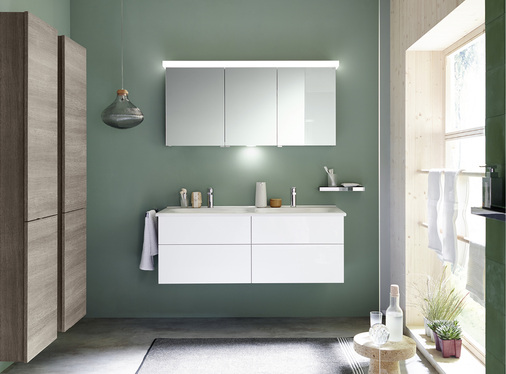 Deren moderne horizontale Aufteilung wird durch chromfarbene Griffleisten unterstrichen. Optional ermöglichen die überstehenden Fronten aber auch einen grifflosen Auftritt. Eine weitere Alternative sind Stangengriffe. Alle Waschtischunterschränke sind hochwertig mit Auszügen ausgestattet. Hochschränke und halbhohe Varianten zeichnen sich durch eine geschickte Aufteilung in Türen, Schubladen, Auszügen sowie ein funktionales Innenleben aus.