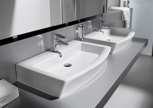 Keramikkörper: Aufsatzwaschtisch 75 cm, Waschtisch wandhängend 75, 65, 55 cm, Halbsäule für Waschtische 75, 65 und 55 cm, Aufsatzwaschtisch sowie wandhängend 65 cm asymmetrisch, Waschtisch-Schale 52 cm, Handwaschbecken 50 cm mit/ohne Hahnloch links oder rechts, Handwaschbecken 45 cm, Wand-WC Tiefspüler (auch kompakt), Stand-WC Tiefspüler für aufgesetzten Spülkasten, Spülkasten, Wand- und Standbidet (auch als kompakte Version), Urinal und wasserloses Urinal mit/ohne Deckel