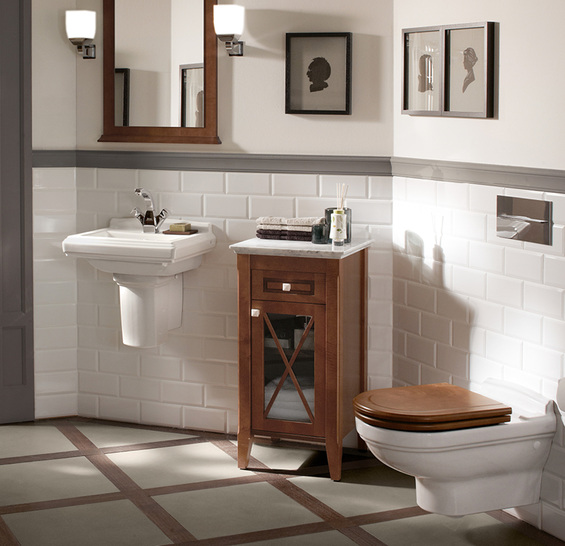 Die traditionellen Formen lassen Hommage ausgesprochen prägnant erscheinen und geben ihr eine klassisch stilvolle Anmutung. Die feinen Stufen als typische, dekorative Elemente nehmen der Keramik die Härte und der warme Nussbaumton der Möbel verleiht dem gesamten Bad eine elegante Note. Die aufeinander abgestimmten Sanitärelemente und das passende Möbelprogramm wirken komfortabel, luxuriös und zugleich behaglich, harmonisch sowie dekorativ.