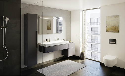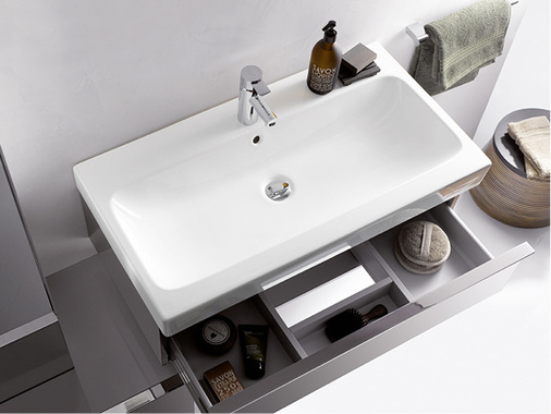 In Form und Funktion abgestimmte Unterschränke, Hochschränke, Seitenschränke, Lichtspiegelelemente und Ablagen sorgen für Stauraum und Ablagemöglichkeiten. Die Serie beeindruckt besonders durch ihre Wandlungsfähigkeit.