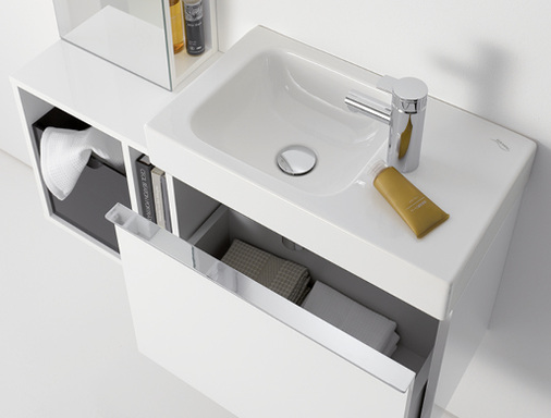 Für die Waschtische und die Handwaschbecken stehen Waschtischunterschränke, Seitenelemente, eine Ablage, ein Regal mit Spiegelfront sowie ein Lichtspiegel zur Auswahl. Die Möbelelemente sind in den Farben Weiß Alpin, Burgund und Platin erhältlich. Das Baukastensystem ermöglicht einen beachtlichen Spielraum bei der An- und Zuordnung der einzelnen Elemente. So erhalten die Waschtischunterschränke ihre logische Ergänzung durch die direkt anschließenden Seitenelemente, die neben einem Fach für Zeitschriften ein separates Fach mit einer schwarzen Plexiglas-Box für benutzte Gästehandtücher aufweisen. Die breiten Waschtischunterschränke sind mit Auszügen ausgestattet.