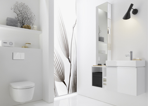 Zusätzlichen Stauraum bieten die Spiegelregale mit reduzierter Ausladung, die über den Seitenelementen oder einzeln installiert werden können. Das Lichtspiegelelement kann sowohl über dem Handwaschbecken als auch versetzt über dem Waschtisch positioniert werden. Komplettiert wird iCon xs durch ein raumökonomisches Tiefspül-WC, das auch als spülrandlose Rimfree-Variante lieferbar ist.