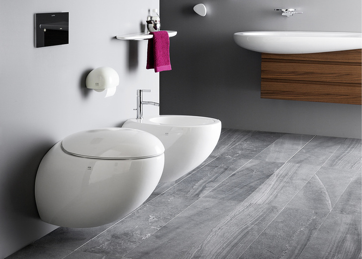 Zubehör: Badewannen aus Sanitäracryl und Mineralwerkstoff für verschiedene Einbau-situationen, auch mit Schürze, optional mit Whirlsystem, WC-Sitz mit Deckel abnehmbar mit Absenkautomatik, Spülkasten, Rollenhalter, Ablage mit Handtuchschlitz, Handtuchhalter