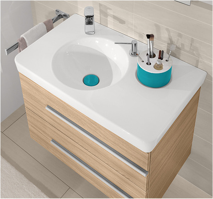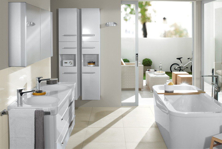 Zubehör: App-Schalen in den Höhen 30 mm, 60 mm und 90 mm mit verschiedenen Einsätzen (Duftvase, Seifenschale u. a.), Spiegelschrank My View mit individualisierbarer Inneneinteilung, Badewannenkollektion Loop & Friends, keramisches Ablaufventil in White, Peru, Bali und Sahara