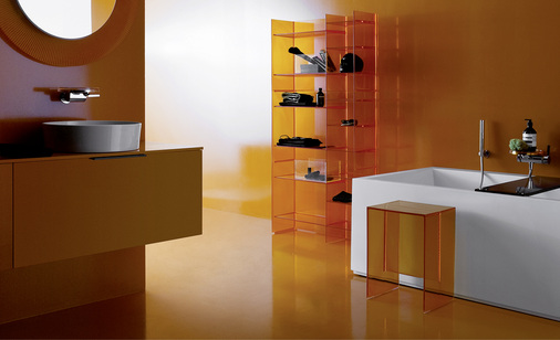 Kartell by Laufen stellt sich als integrierte Architektur dar, als ein verflochtenes Ökosystem, in dem Waschtische, WCs, Bidets, Armaturen, Möbel, Dusch- und Badewannen, Beleuchtung und Accessoires flexibel zusammenleben und sich wie Chamäleons den unterschiedlichsten Vorlieben anpassen. Die gläserne Transparenz des Polykarbonats und die definierten Kanten der filigranen Waschtische aus der Saphirkeramik von Laufen begeistern alle, die minimalistisches, reduziertes und raffiniertes Ambiente lieben. In diesem Bad nähern sich die Formensprachen von Kunststoff und Keramik einander an. Die strenge Geometrie der Keramikteile löst sich dabei in der mehrfarbigen Leichtigkeit der Kunststoffelemente auf und es entsteht ein Freiraum, in dem sich die Sinne den Gefühlen hingeben können.