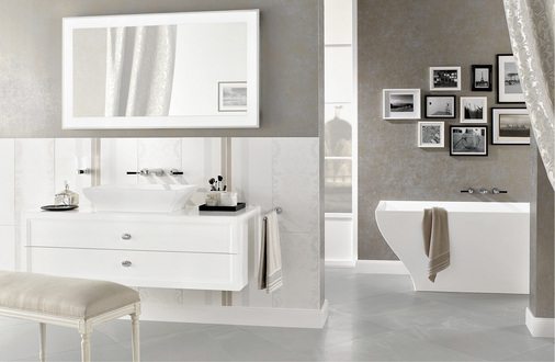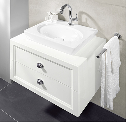 Die aus Quaryl gefertigte Duo-Badewanne ist auf die Außenkonturen der Möbel abgestimmt. Die Einbauvariante kann optional mit den Whirlpoolsystemen ausgestattet werden. Die frei stehende Badewanne ist seit der SHK 2016 als Bicolor-Variante mit weißen Innenflächen und Schürzen in über 200 Farben erhältlich. Das handlackierte Premium-Möbelprogramm wird in der Farbe Weiß Glanzlack angeboten. Der schlanke Waschtischunterschrank verstärkt die feminine Anmutung des Waschplatzes, während die Unterschrank-variationen mit Auszügen die moderne Seite der Kollektion her-vorheben. Samtbeflockte Schubladenböden und dekorierte Glasflachböden verleihen den Möbeln eine besondere Wertigkeit.