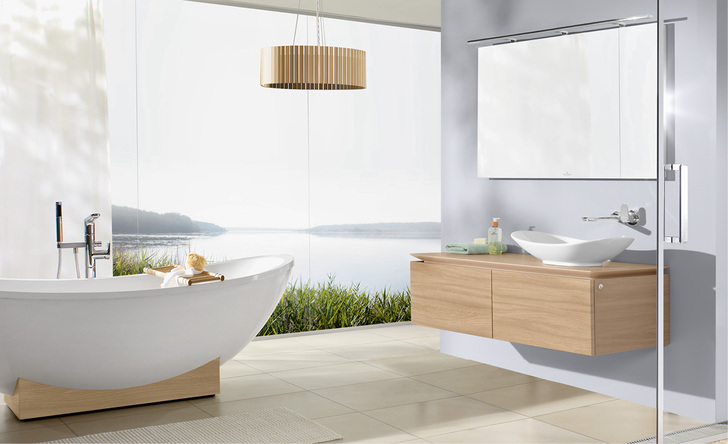 Das WC mit unsichtbarer Befestigung benötigt lediglich 4,5 l Wasser. Blickfang der Kollektion ist die großzügige Badewanne. Freistehend ruht sie auf einem Holzpodest und wird zum Mittelpunkt des Bades. Als Einbaulösung ist sie whirlpoolgeeignet.