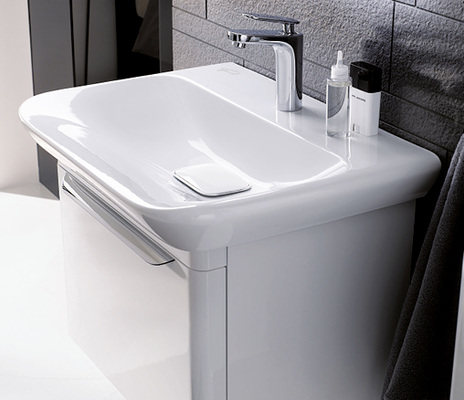 Auch die schlichte Gestaltung des wandhängenden WCs und Bidets harmoniert. Auffällig sind die sanft geschwungene Seitengestaltung und die sich nach unten verjüngende Formgebung. Auch das Möbelprogramm in vier Farben, dessen softe Grundlinie sich sowohl bei den Objekten als auch bei den Griffen wiederfindet, setzt auf Formgebung und Funktionalität. Komplettiert wird die Serie durch zwei in Form und Funktion abgestimmte Wannen. Sie umfasst Waschtische, einen Doppelwaschtisch, Einbauwaschtische, Handwaschbecken, Tiefspül-WC (auch als spülrandlose Rimfree-Variante erhältlich), Bidet, Möbelunterschränke, einen Hochschrank, Lichtspiegelelemente und die beiden Badewannen.
