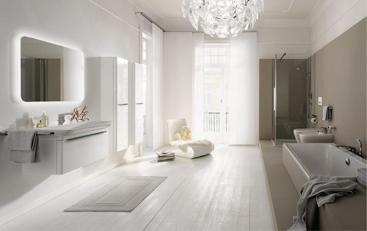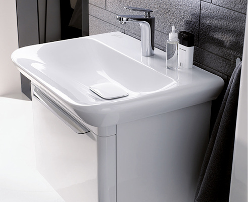 Auch die schlichte Gestaltung des wandhängenden WCs und Bidets harmoniert. Auffällig sind die sanft geschwungene Seitengestaltung und die sich nach unten verjüngende Formgebung. Auch das Möbelprogramm in vier Farben, dessen softe Grundlinie sich sowohl bei den Objekten als auch bei den Griffen wiederfindet, setzt auf Formgebung und Funktionalität. Komplettiert wird die Serie durch zwei in Form und Funktion abgestimmte Wannen. Sie umfasst Waschtische, einen Doppelwaschtisch, Einbauwaschtische, Handwaschbecken, Tiefspül-WC (auch als spülrandlose Rimfree-Variante erhältlich), Bidet, Möbelunterschränke, einen Hochschrank, Lichtspiegelelemente und die beiden Badewannen.