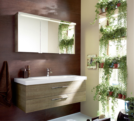 Dazu passt indirektes, blendfreies Licht von oben. Doch auch ohne die optionale LED-Waschtischbeleuchtung bietet die Ausstattung der Spiegelschränke mit zwei bzw. drei beidseitig verspiegelten Türen zahlreiche Annehmlichkeiten: Glaseinlegeböden, Doppelsteckdose, Vergrößerungsspiegel sowie eine Magnetleiste. Außerdem sehen die Sets Kombinationen aus Waschtischen mit Leuchtspiegeln vor. Hochschrank, halbhoher Schrank sowie weitere passende Keramik- und Mineralgusslösungen aus dem Programm von burgbad runden das Sortiment ab.