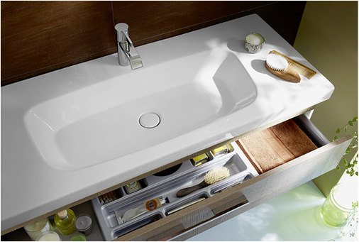 Das für die Serie charakteristische Waschbecken scheint zu schweben. Eine breite, umlaufende Fuge lässt seine ruhige, rechteckige Gestalt abheben – mit dem feinen Nebeneffekt, dass die passenden Unterschränke trotz großen Volumens schön schlank wirken. Klare Keramik mit dynamisch gespannter Innenform trifft auf wohnliche Fronten in Holzoptik mit fühlbarer Struktur. Die Dekore heißen Eiche naturbeige bzw. Eiche graubraun Wellenschlag. Neu sind Eiche Dekor Toffee, Eiche Dekor Alaska, Eiche Dekor Vermont, außerdem Acrylfronten in Weiß Hochglanz, Grau Hochglanz und Schwarz Hochglanz. Drei Einzelwaschtische und ein Doppelwaschtisch, alle Modelle inklusive Unterschrank mit Auszügen und teilweiser Innenausstattung, stehen zur Wahl.