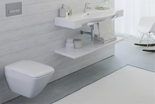 Außerdem gehören vier Einzelwaschtische und ein 130 cm breiter Doppelwaschtisch sowie ein Handwaschbecken zum Programm von Palace. Die Einzelwaschtische und der Doppelwaschtisch sind mit Halb- oder Standsäule oder als Möbelwaschtisch mit Unterschrank erhältlich, dazu ist eine passende verchromte Handtuchreling wählbar. Ein umfangreiches Sortiment an WCs und Bidets inklusive einer spülrandlosen wandhängenden Version, alle mit versteckten EasyFit-Befestigungen, vervollständigen Palace. Darauf abgestimmt ist Case for Palace, ein Möbelprogramm in zeitlos-reduziertem Design. Speziell für Hotels hat Laufen auch Keramikablagen in den Abmessungen der Waschtischkonsolen entwickelt, die sich einfach befestigen und auf Maß schneiden lassen. Praktisch sind auch die drei neuen, vorkonfektionierten Laufen-Palace-Combi-Packs aus den extra dünnen Waschtischen in den Größen 60, 80 und 100 cm in Kombination mit dem Base-Unterbauschrank mit zwei Schubladenelementen.