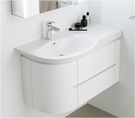 Funktionales und optisches Highlight von Palace sind die eindrucksvollen Waschtischkonsolen (Design: Andreas Dimitriadis) mit ihren großen, tiefen Becken und viel Ablagefläche. Sie sind in vier Breiten erhältlich – in den beiden größten Varianten auch als Doppelwaschtisch. Bis auf den kleinsten können diese Waschtische ab Werk zugeschnitten werden, selbst schräge Schnitte sind möglich. Schneidbar sind auch die 90 und 120 cm breiten asymmetrischen Waschtische mit Becken links oder rechts und reichlich Ablagefläche. Diese Lösungen sind ideal für Hotelbäder und Privatbäder, die auf Maß gearbeitet werden.