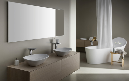 Seit ihrer Einführung im Jahr 2005 oszilliert die Formensprache der Palomba Collection zwischen strenger Geometrie und organischer Form. Dominierten bei den letzten Editionen eher die geometrischen Formen, rückten die italienischen Designer Ludovica und Roberto Palomba mit der jüngsten Erweiterung wieder softe Linien in den Fokus, die wirken, als wären sie durch das Wasser erschaffen worden. Die schwungvollen Formen des bodenstehenden Keramik-Waschtisches, der als freistehende oder wandmontierte Version erhältlich ist, wie auch der Mineralguss-Badewanne, visualisieren den „Fingerprint of Nature“ – ein Designmerkmal, das die gesamte Palomba Collection charakterisiert und dafür sorgt, dass alle Stücke miteinander kombiniert werden können.