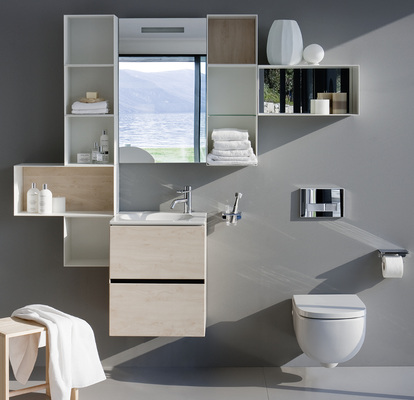 Einen organischen Charakter tragen auch die beiden neuen, asymmetrischen Waschtischschalen der Palomba Collection. Die 520 x 380 mm große Schale eignet sich für freistehende Armaturen und Wandausläufe, da sie keine eigene Armaturenbank hat. Die 600 x 400 mm große Schale ist dagegen mit einer Armaturenbank ausgestattet. Mit vier unterbaufähigen Waschtischen in den Längen 500, 650, 800 und 1000 mm schließt Laufen an die bestehende Waschtisch-Edition an, bei denen ein organisch geformtes Becken fast wie eine Lagune in ein planes, mit 16 mm äußerst flaches Waschtischpaneel sanft eingelassen ist. Neben Waschtischunterschränken gehören Hochschrank und Halbhochschrank, zwei Waschtischplatten sowie das modulare Mobelboxsystem zum Sortiment der Collection.