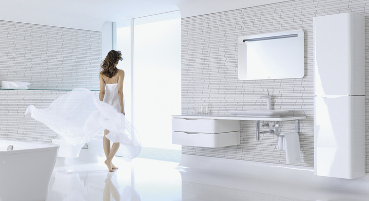 Der Unterschrank verfügt optional über Glaseinteilungen, in den Hochschrank ist ein Auszug integriert und ein praktischer Rollcontainer ergänzt das Sortiment. Spiegel und Spiegelschränke und eine Einbau-Badewannenkollektion mit weißem LED-Licht sowie die Armaturenserie PuraVida von Hansgrohe vervollständigen die umfangreiche Kollektion.
