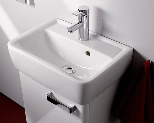 Mit der im rechteckigen Design gestalteten Serie Renova Plan bietet Geberit auch im designorientierten und attraktiven Preissegment für den Mietwohnungsbau sowie die öffentlichen und gewerblichen Sanitärbereiche die passenden Produkte. Die eckigen Plan-Waschtische zeichnen sich durch eine strenge Geometrie mit weicher Kummengestaltung und breitem Rand aus. Alle Waschtischmodelle können mit Halbsäule und Kerafix-Schnellbefestigung sowie passenden Waschtischunterschränken kombiniert werden. Die Waschtische können standardmäßig an der Wand befestigt oder auf eine Platte aufgelegt werden.